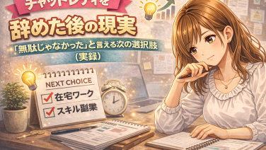 稼ぎ方・運用 チャットレディを辞めた後の現実|「無駄じゃなかった」と言える次の選択肢(実録) チャットレディを辞めた後に直面する現実と、経験を無駄にしない次の選択肢を実体験ベースで解説。向いていた点・向いていなかった点の整理、次に進むための判断軸をまとめた実録アーカイブ最終章。 2026.01.30 稼ぎ方・運用