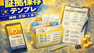 ポイ活の確定申告で否認・計上漏れを防ぐ「証拠の残し方」完全テンプレ。ポイント通帳・交換履歴・入金明細・スクショの撮り方、月1保存フォルダ、雑所得/一時所得の分岐、集計表、按分、住民税の注意までまとめて整理します。