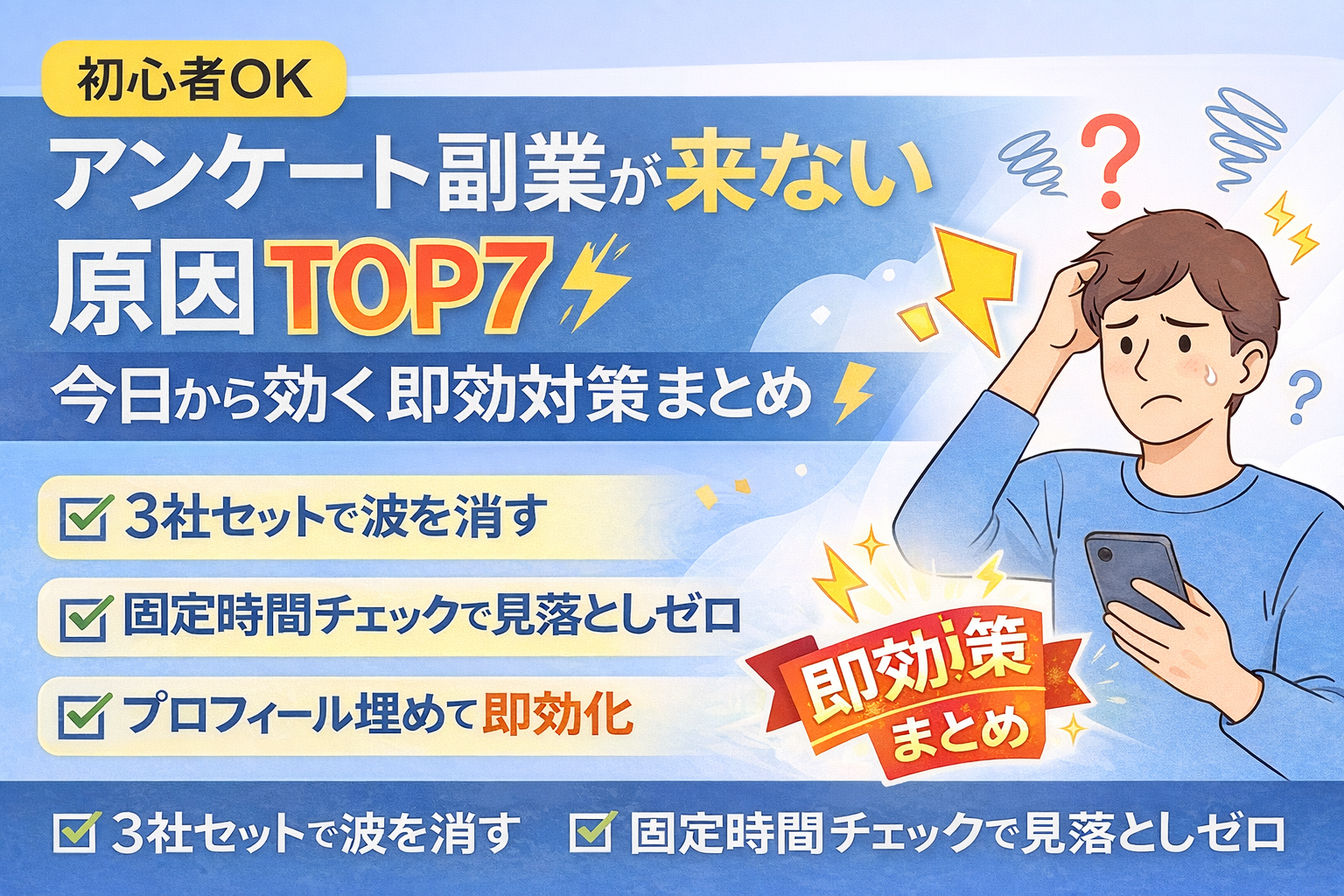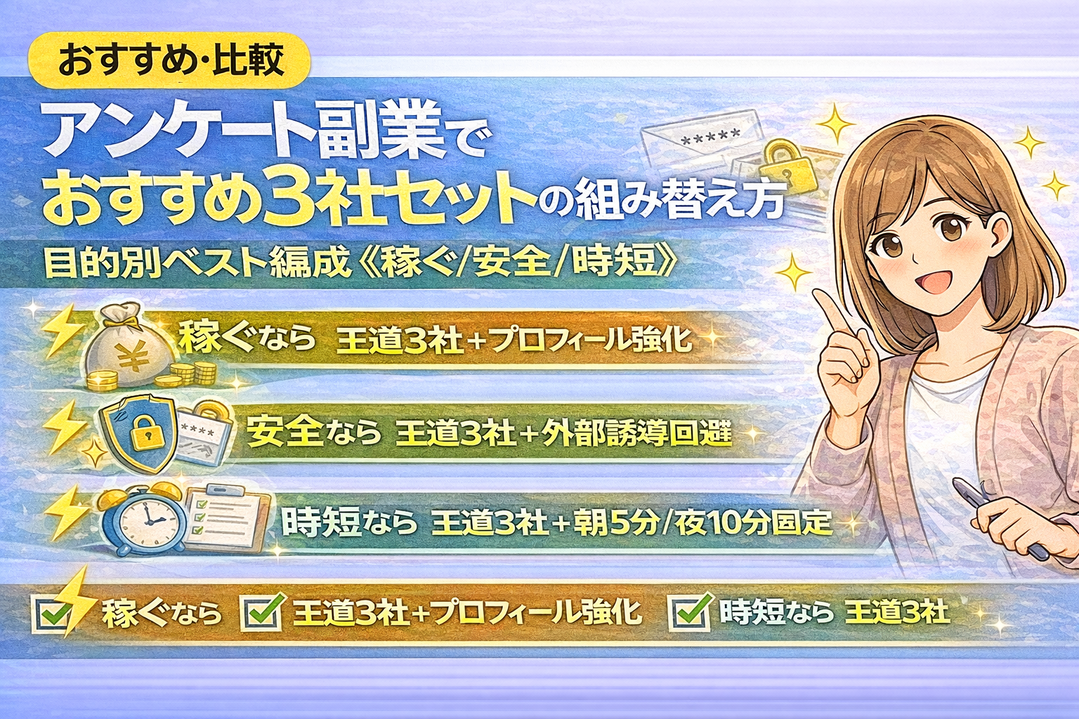 アンケート副業は「3社セット」が安定の基本。ただし目的(時短・安全・月1万円狙い)で最適な組み替えが変わる。王道3社を軸に、目的別のベスト編成と運用ルールを整理。