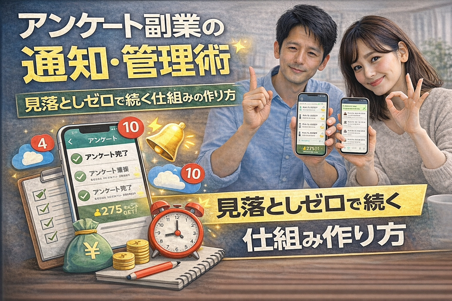 アンケート副業は時間がない人ほど「隙間の型」が必要。朝夜の固定時間、待ち時間の回収、通知に追われない仕組み化で、家事育児・仕事と両立しながら続ける方法をまとめる。