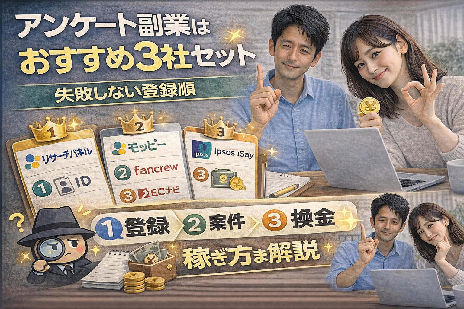 アンケート副業は「3社セット」が安定の基本。ただし目的(時短・安全・月1万円狙い)で最適な組み替えが変わる。王道3社を軸に、目的別のベスト編成と運用ルールを整理。