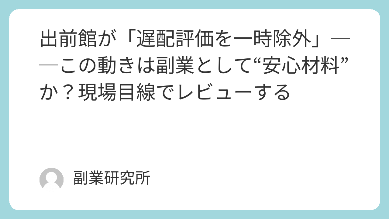 僕は“キャンペーン中だけ”って言葉が一番引っかかった。普段から詰んでる注文はある。そこを見ないまま、困った時だけ免除するのは、長期で信頼を削ると思う。出前館が副業として「腰を据えられる場所」になるには、平時の責任切り分けと時間設計の改善が必須だ。ここが変わるなら、評価も変わるし、現場の空気も変わる。