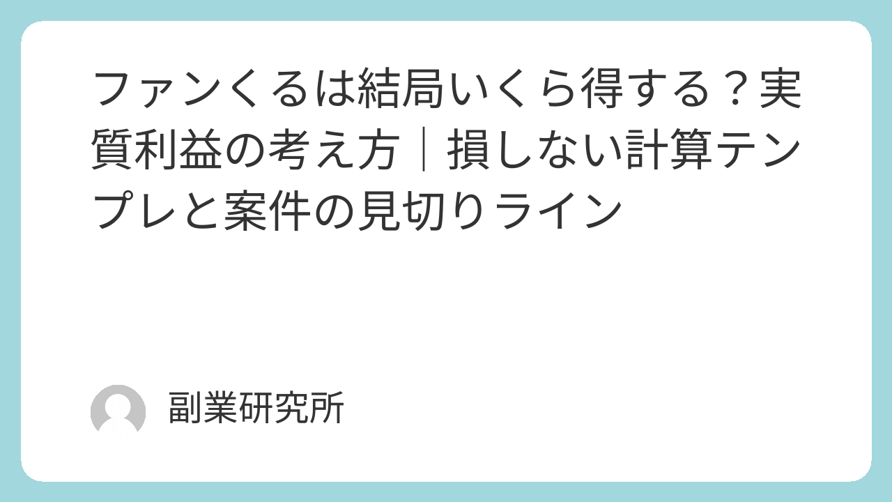 【ファンくる案件メモ】 自腹:¥ 戻る分:¥ 交通費:¥ 時間: 分(移動+滞在+提出) 実質利益=戻る分-自腹-交通費=¥ 実質時給=実質利益÷時間=¥/h 判断:やる/捨て