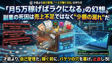 副業で必要なのは、稼ぐ力だけではありません。100円、300円、1,000円の小さな漏れを放置する人は、売上が出てもお金が残りません。副業の死因は売上不足だけでなく、管理不足による“少額の漏れ”です。一人で稼ぐOSとしてのお金管理を整理します。